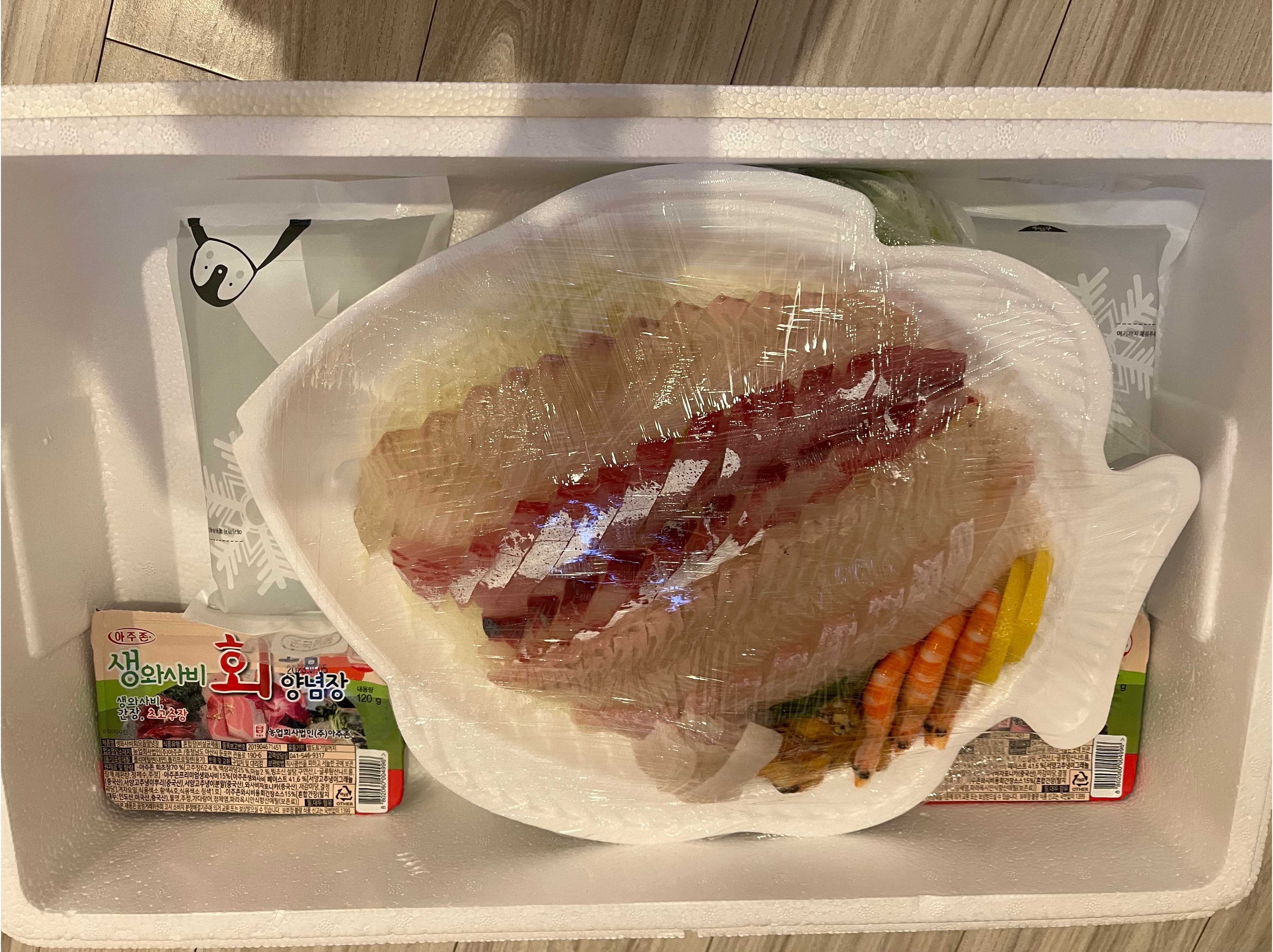 저희는 모둠소로 주문했는데 모둠소는 3만원에 광어, 방어, 보리숭어에 멍게, 새우가 들어가 있어요 회는 제철 회로 변경이 된다고 해요 가는길에 혹시 몰라 요금을 추가하고 박스포장을 했어요