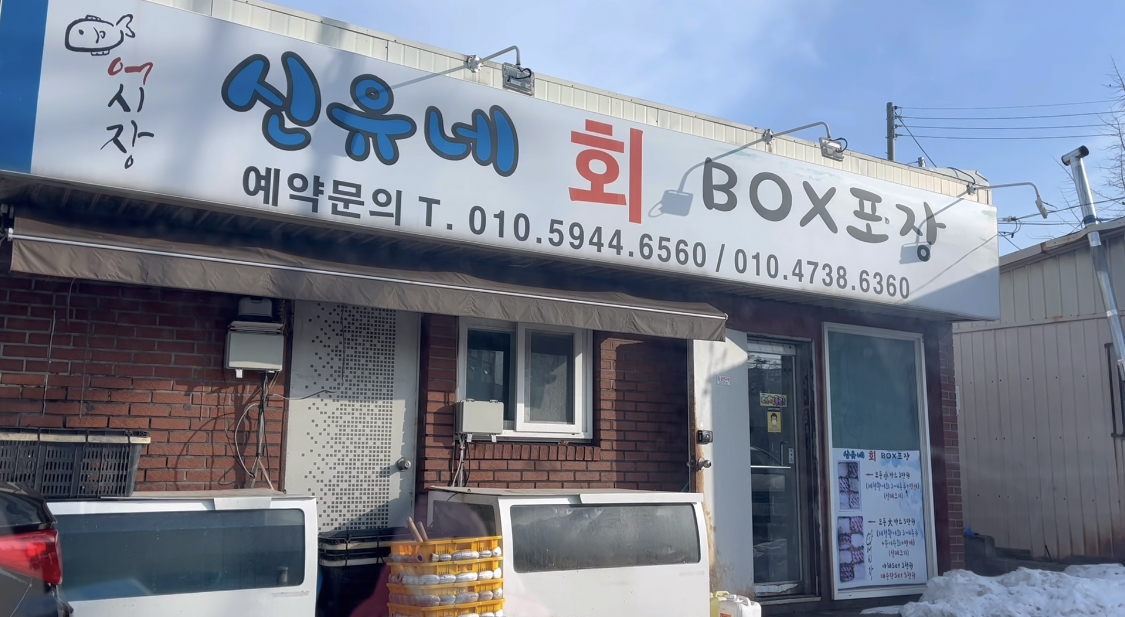 강릉 숙소에서 먹을 회를 알아보다가 속초에서 회포장전문으로 유명한 신유네회에 예약을 했어요 당일은 안될 수도 있어서 1주~2주전에 문자로 예약하면 돼요